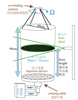 这里应当指出的是:在不同的场景中,湍流的形态不尽相同。当流体在整体上进行旋转运动时,此时的湍流被称为旋转湍流。自然界的台风、气旋等就是典型的旋转湍流。而在工程应用中,传统的动力机械常常是通过旋转与压缩、膨胀等效应来进行机械功与内能、化学能之间的能量转换,这里往往也涉及到旋转湍流。目前人们对于旋转湍流的研究仍然主要停留在基础研究的层面。以旋转圆筒实验为例(参见图6左),研究者们将坐标系固定在旋转的圆筒之上,这是通过与圆筒同步旋转的相机来实现的。在这种坐标系变换下,圆筒旋转效应具体化为两种虚拟力:离心力与科氏力(参见图6右)。离心力使回转的流体微团远离它的旋转中心,而科氏力则描述旋转系中流体微团的惯性偏移。对于不可压缩流体而言,离心力的效应可以与压力作用合并进行研究,所以人们的研究重点放在了科氏力上面。这里介绍我们团队在这个领域的研究工作进展。