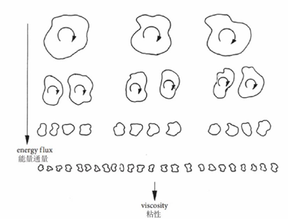 当然,如果从数学的角度来看,流体运动的控制方程(Navier-Stokes方程)是一个典型的非线性方程,所以湍流问题本质上是一个非线性问题。随着对湍流认识的加深,人们也加深了对一类非线性问题的认识。在湍流的基础研究中,研究者们很关注的一点是:多尺度效应及级串。这里的“尺度”是指湍流中旋转运动着的流体微团的大小,这些微团也被称之为“旋涡”。在湍流中包含着大大小小的旋涡,所以流动可以被分解为不同的尺度。它们之间存在着动量、能量等物理量的交换(力学家采用术语“输运”来描述这个交换过程)。所谓的“级串”可以被简单解释为能量或其他物理量在不同尺度之间的输运。英国科学家路易斯弗莱 理查德森写于1922年的一首小诗最早给出了关于级串的抽象描述:“大旋涡育小旋涡以动能,小旋涡亦以此孕子女,生生世世以之更迭,终消于粘滞”(参见图5)。而“粘滞”则和流体的一个固有物性“粘性”(viscocity)相关,后者表示流体内部各微团或流层之间由于具有相对运动而产生内摩擦力以阻止流体做相对运动的性质。在湍流中,一般而言,能量由大尺度向小尺度输运,这通常被称为正向级串。反之,当能量由小尺度向大尺度输运时,则被称为反向级串。