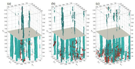 此外,我们还研究了流向旋转槽道湍流中的涡结构(参见图13)。这类流动最显著的特点在于流向旋转会引入展向二次流,即与主流方向垂直方向上的流动。这种二次流会在槽道中心区变号,被称为槽道中心的反向二次流。随着旋转加强,脉动流中也出现了大尺度准流向涡结构。弱旋转下,这种大尺度准流向涡实际与流向呈现一定倾角,如图13所示。但在强旋转下,这种涡结构则是基本与流向对齐的。